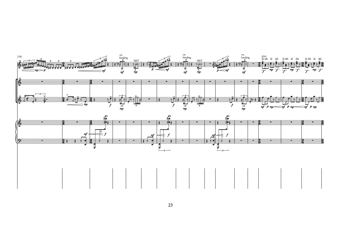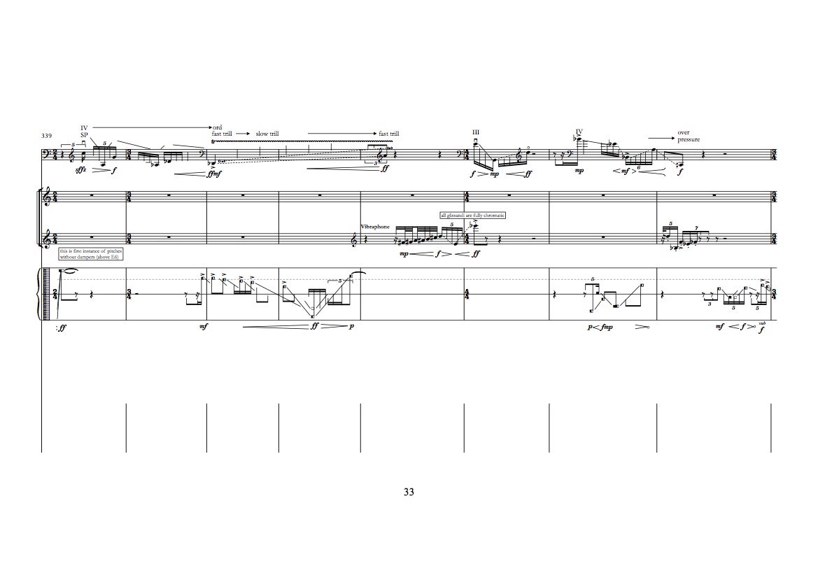 Dot Matrix Dialect is music composed of points. These points populate the gestural language of the instruments and the electronics. On the one hand these points are content being transitory, being indivisible, adding emphatic punctuation without having any clear ideas to punctuate. On the other hand these points are desperate to be building blocks, to form the seductive curvature of glyphs and characters, to spell out words and assemble thoughts, to migrate into the sky and form the shapes that tell stories. But, alas, they are only points.