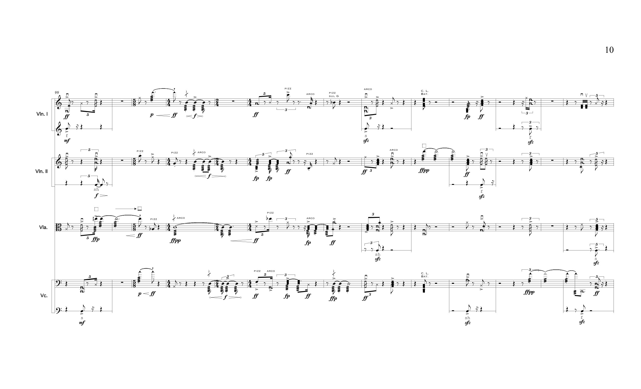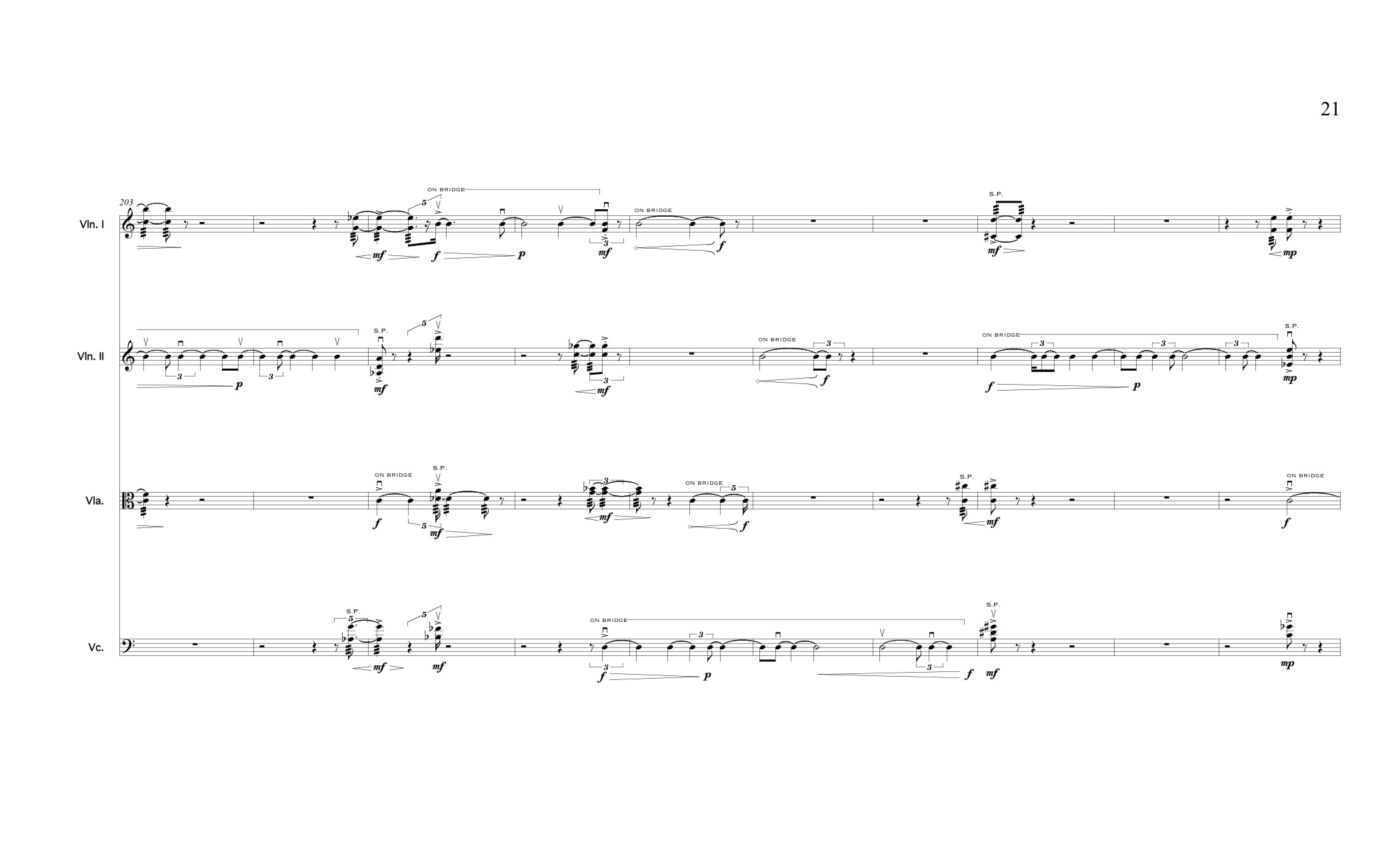 String Quartet no. 1 marks a time when I turned away from melody-centric music and found new approaches to organizing my compositional thinking. I envision the piece as a set of sonic objects and environments which oscillate between phenomenological and musical settings. I use these words - music and phenomenon - not because I believe they are easily defined or parsed; but because, through attempting to establish a space connecting them, I hope that music will blossom out of sound; that musical passages will arise from process; and that music will be discovered rather than asserted.