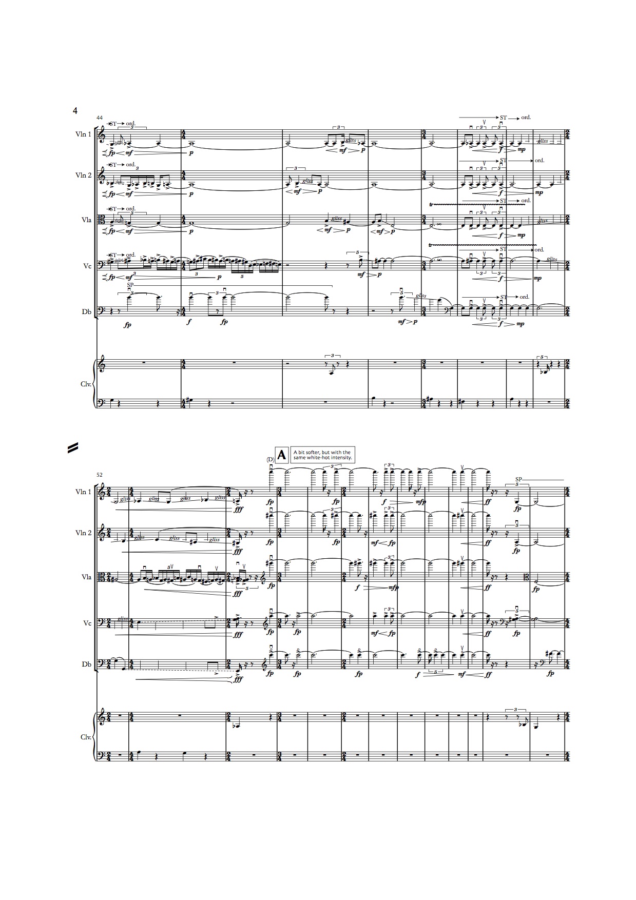 Volleys of Light and Shadow revolves around exchanges of energy between contrasting forces: the acoustic and the electronic, the seen and the unseen, the tangible and the mysterious, the tethered and the unleashed. A kind of repetitive and slowly-evolving canon is created between gestures iterated by the ensemble and the spatialized computer sound. While these canons often create a dialogue that evolves gradually and somewhat logically, the overarching formal design focuses on connecting improbable and unlikely endpoints. Thus, as the piece progresses, that which stabilises gives way to movement, that which commands attention subsequently disintegrates, and that which behaves becomes wild and unwieldy. These contradictions create a listening experience cloaked in fog, as objects which seem present are revealed to be mere shadows.